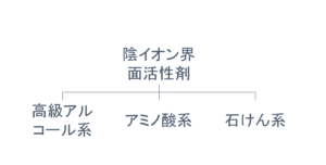 陰イオン(アニオン)界面活性剤は、下図のように高級アルコール系、アミノ酸系、石けん系の3つに細分化されます。
