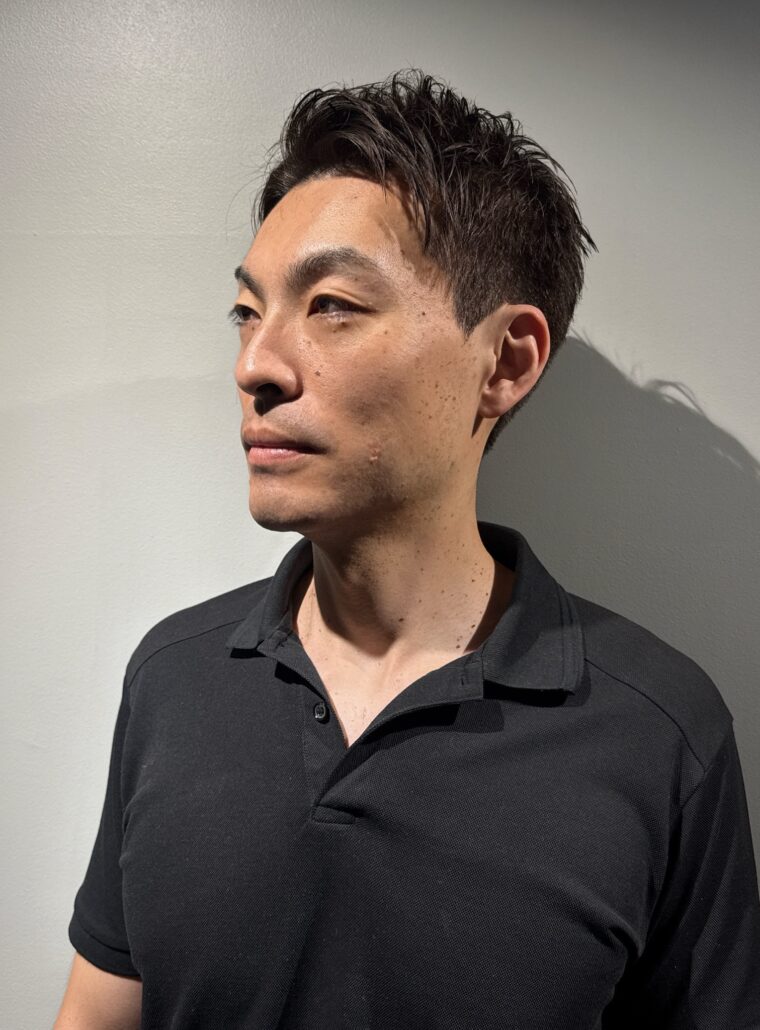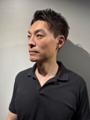- 前髪を立ち上げるようにドライした後、ワックスなどのスタイリング剤を髪全体に均一になじませます。トップはふんわりと立ち上げ、前髪の中央は上げつつ、目尻の上あたりの両サイドは軽く下ろして流すように整えることで、立体感と柔らかさを兼ね備えたバランスの良いスタイルに仕上がります。