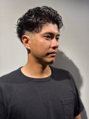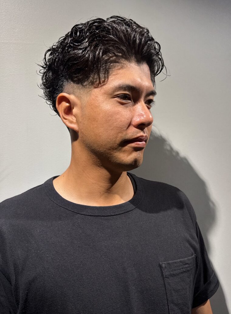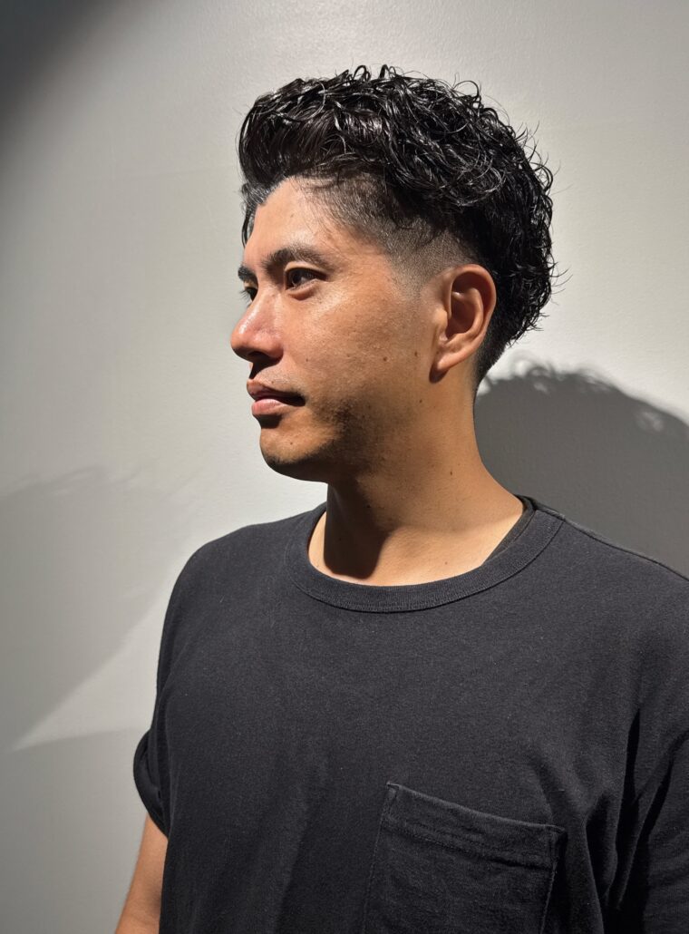 Name 毛流れパーマ Data styleパーマ lengthショート setジェル、グリース Point トップと前髪を立ち上げるようにハーフドライで乾かした後、スタイリング剤を髪全体に均一になじませます。ウェーブ感を損なわないよう注意しながら、後ろへ流すようにセットします。